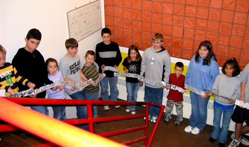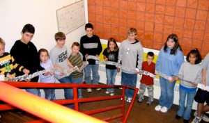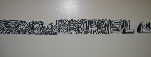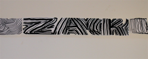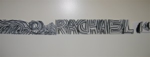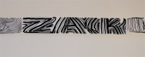 Before our visit Anne and I had our K-8 students from Union Elementary and D.R. Gaul Middle School create artwork on 3″x12″ white drawing paper using black sharpies. They started with their names in the center and went around and around with contour lines. Every student and staff member participated with the idea that everyone has an important part in the school community (and world) and that each of our parts are important to the whole. Without everyone doing their part there is a hole.