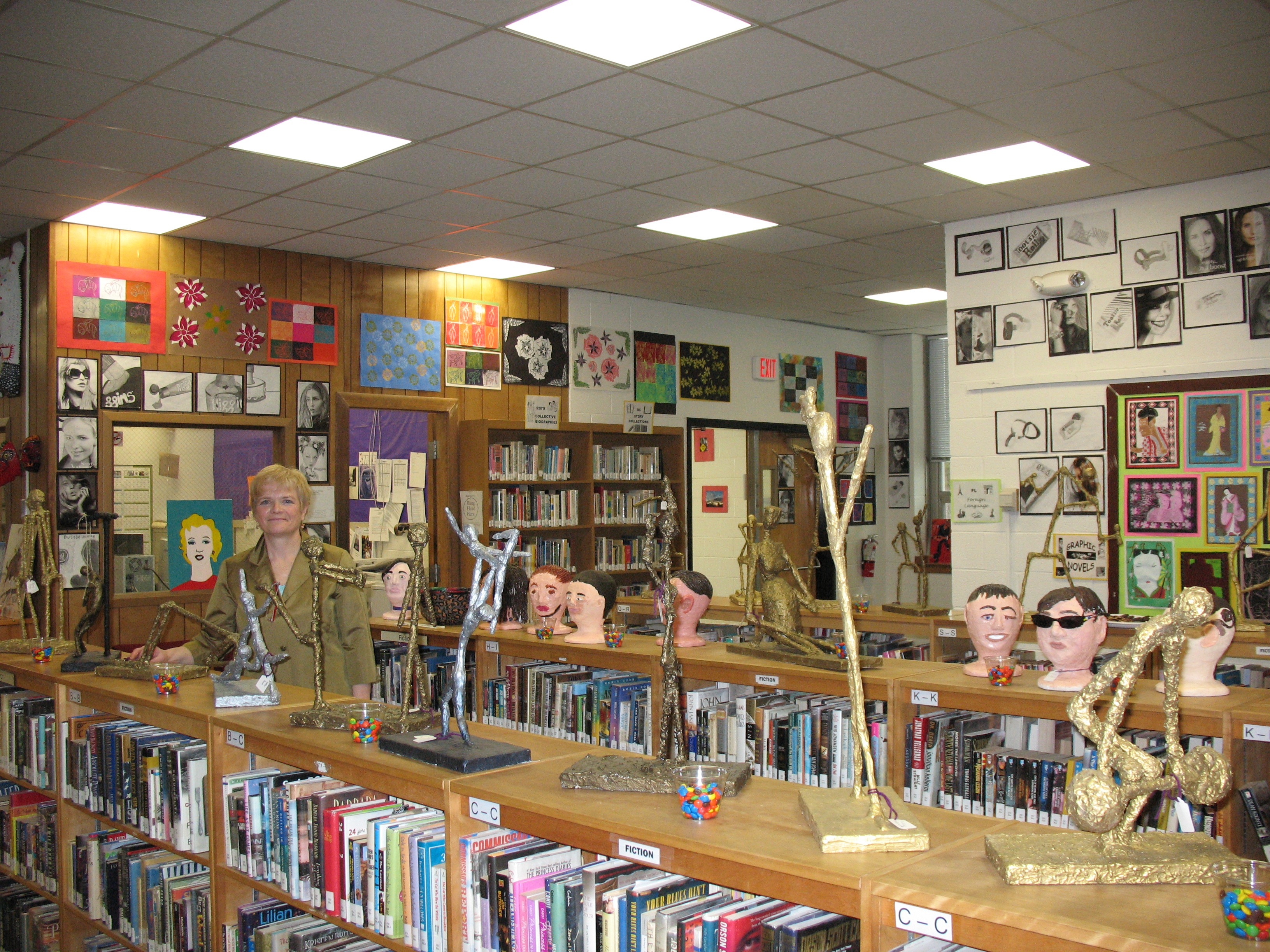 They were the words Bucksport High School art teacher Holly Bertrand used to describe the art exhibit that she invited me to and it was a GREAT description! The dripping started in the lobby area of the school and continued down the hall, up the steps, around the corner and throughout the library amongst the encyclopedia, between the books, on shelves, covering walls, above the doors, and around the windows.