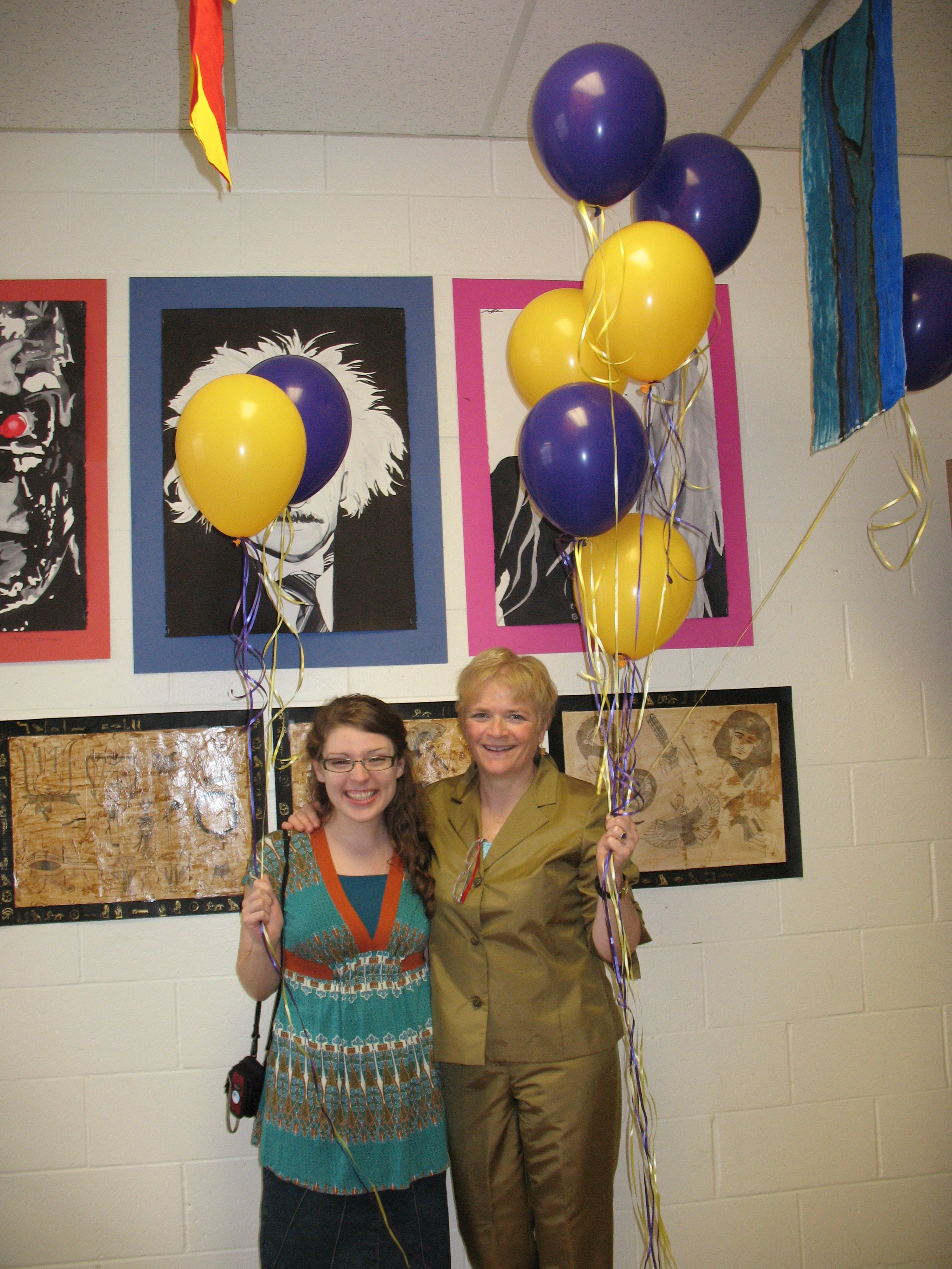 I arrived a bit early when the last piece of art was being taped to the wall, before the trays of cookies were uncovered, just after the flowers were put in place and before the balloons arrived. Not an ‘i’ was left undotted, nor a ‘t’ uncrossed. Holly said she had plenty of help including her student teacher, Kendra Bruton, from UMaine.