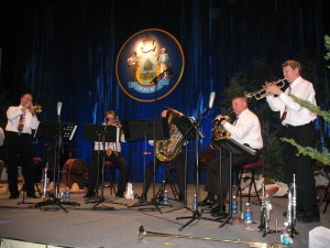 While hundreds of Maine residents attended Governor LePage’s reception on Wednesday evening The Downeast Brass Quintet performed. It was fun to watch and listen to the group, who are not only talented musicians, but they also are music educators. Their “show” includes some numbers with hats and action that are fully appreciated by watching them.