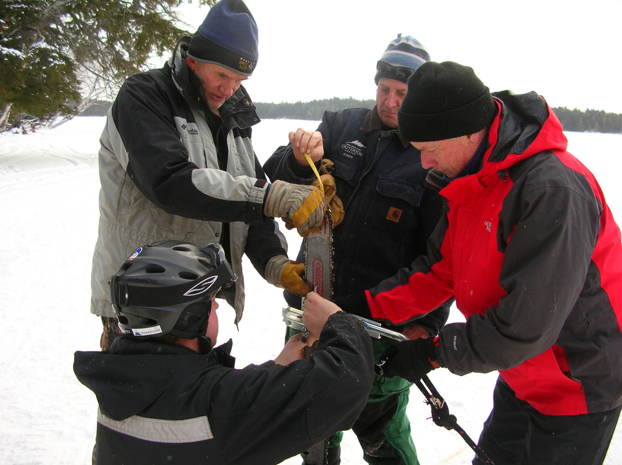 This weekend I had one of those chances. My husband and I traveled to northern Maine to help with “ice cutting” at Libby Camps. It is a place that he is very familiar with since he guides bird hunters there in October each year with his guide service Maine Outdoors. We traveled through Patten on the paper company roads as far as the road was plowed and hopped on snowmobiles for the 6 mile ride through the woods, onto Millinocket Lake and to the other side where the camps are located. All morning and afternoon folks arrived, some on skis, some on snowmobiles. During late Spring, Summer and Fall the road is good enough to drive all the way to camp but none of the nearby roads are plowed this winter let alone the two mile long driveway.