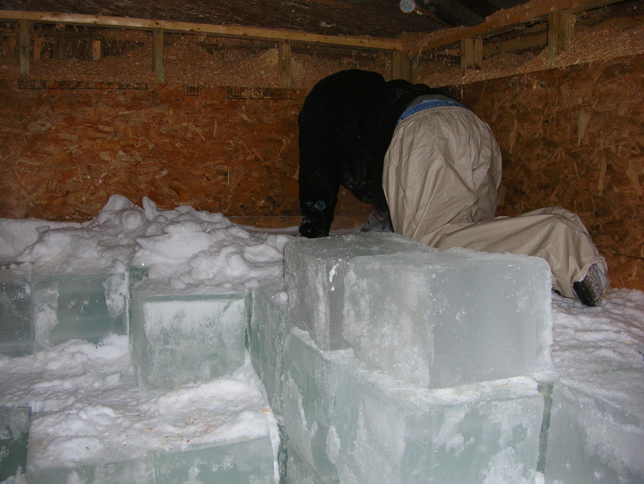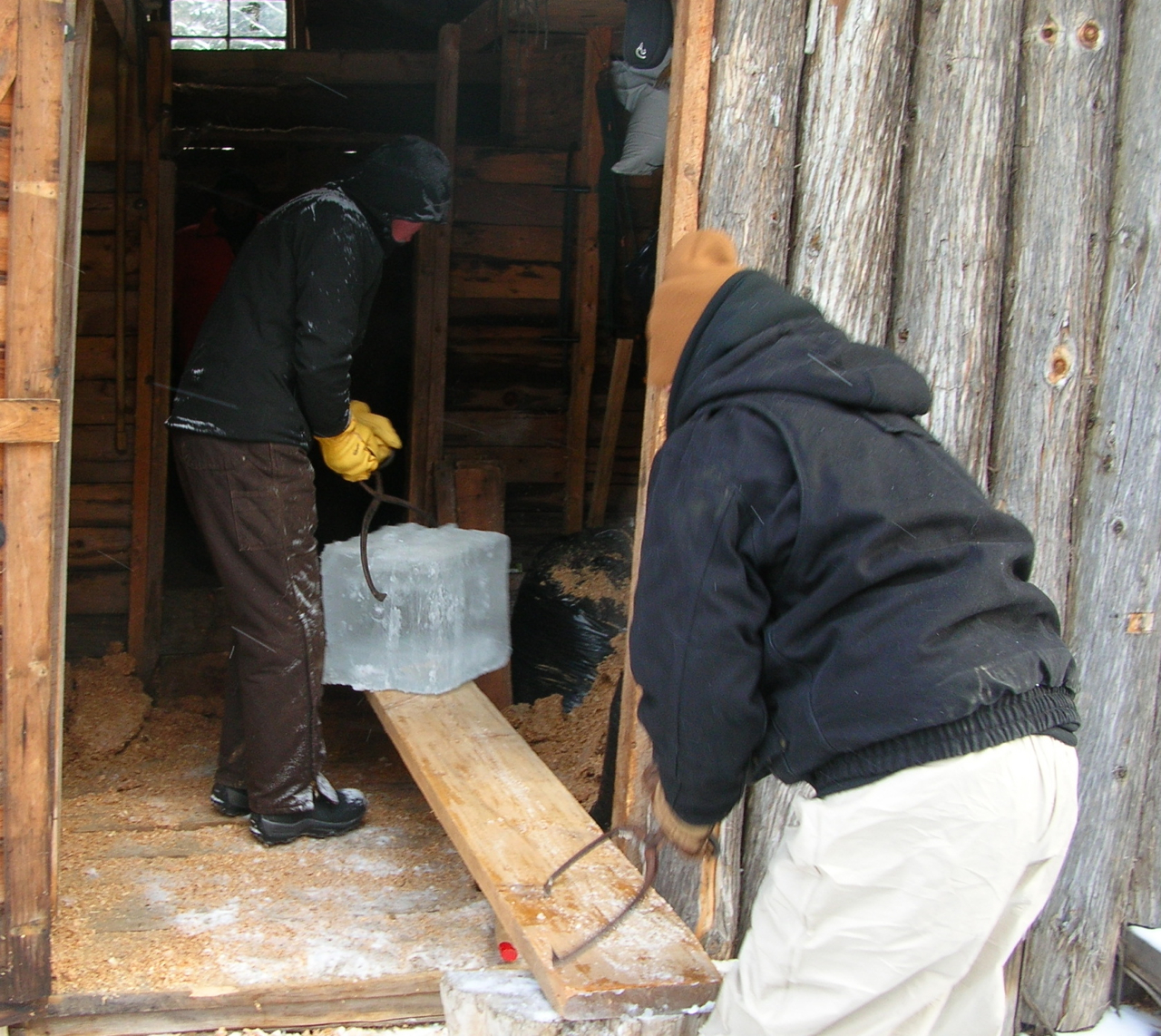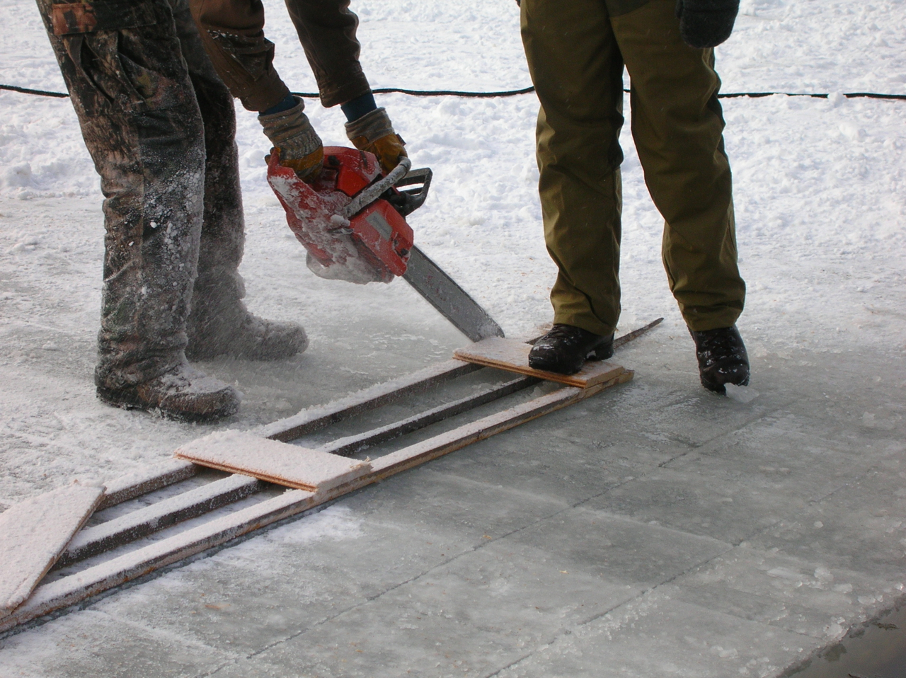 On Saturday we started the day with a hearty breakfast and 23 of us headed down to the lake where the ice cutting got underway. Two places about 20’ x 30’ on the ice were cleared of the 6” of snow. First a “sucker hole” is cut so the blocks of ice can come out easily and to measure how deep the ice is. Two chain saws are used, one to score the ice and one with a 36” blade to cut through the 13” of ice. When the first block came out the folks in the know exclaimed about how perfect the ice was. Snowmobiles with empty tote sleds attached were in place. Large ice tongs were used to lift the huge blocks (maybe 60 lbs.) out of the water, into and out of the sleds. The sleds take the ice up to the icehouse where a crew unloaded and somewhat carefully stacked the blocks for next summer and fall. Loose snow covers the blocks so the layers don’t stick together and along the edges and on top saw dust is used to insulate the blocks. Almost 300 blocks were cut and packed away.