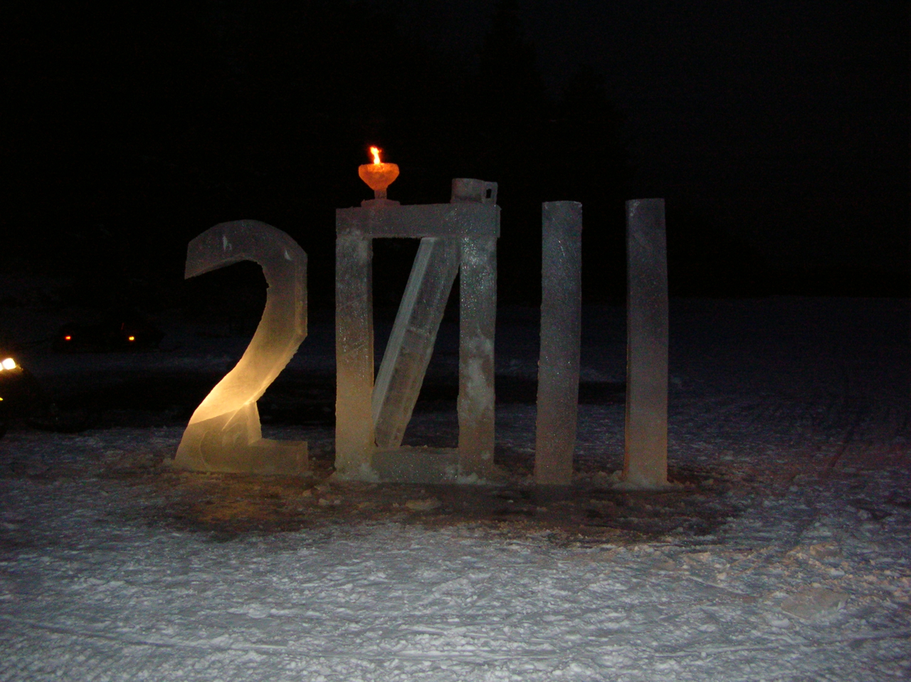 The Libby’s, including Matt and Ellen and their son and daughter in law, Matt and Jesse, were grateful to all who participated and the record ice cutting time left an afternoon of exploring, creating and hanging out by the fire. The creativity exploded with some chain saw sculpting with ice as the medium. Eight foot high numbers making 2011 were cut and stood up and a goblet placed on top.