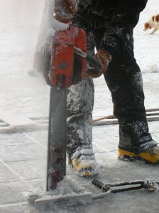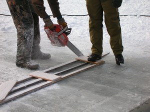 I saw the article in the Bangor Daily News today that they were ice cutting on Little Black Lake 12 miles from downtown Fort Kent where they are constructing the Chateaux Festival, an 80′ x 28′ ice structure for activities associated with the World Cup Biathlon races to begin Feb. 10th. They cut 800 blocks. Did any of you participate?