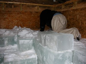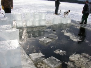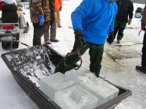 On Saturday we started the day with a hearty breakfast and 23 of us headed down to the lake where the ice cutting got underway. Two places about 20’ x 30’ on the ice were cleared of the 6” of snow. First a “sucker hole” is cut so the blocks of ice can come out easily and to measure how deep the ice is. Two chain saws are used, one to score the ice and one with a 36” blade to cut through the 13” of ice. When the first block came out the folks in the know exclaimed about how perfect the ice was. Snowmobiles with empty tote sleds attached were in place. Large ice tongs were used to lift the huge blocks (maybe 60 lbs.) out of the water, into and out of the sleds. The sleds take the ice up to the icehouse where a crew unloaded and somewhat carefully stacked the blocks for next summer and fall. Loose snow covers the blocks so the layers don’t stick together and along the edges and on top saw dust is used to insulate the blocks. Almost 300 blocks were cut and packed away.