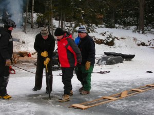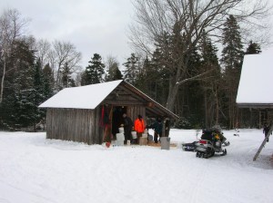 This weekend I had one of those chances. My husband and I traveled to northern Maine to help with “ice cutting” at Libby Camps. It is a place that he is very familiar with since he guides bird hunters there in October each year with his guide service Maine Outdoors. We traveled through Patten on the paper company roads as far as the road was plowed and hopped on snowmobiles for the 6 mile ride through the woods, onto Millinocket Lake and to the other side where the camps are located. All morning and afternoon folks arrived, some on skis, some on snowmobiles. During late Spring, Summer and Fall the road is good enough to drive all the way to camp but none of the nearby roads are plowed this winter let alone the two mile long driveway.