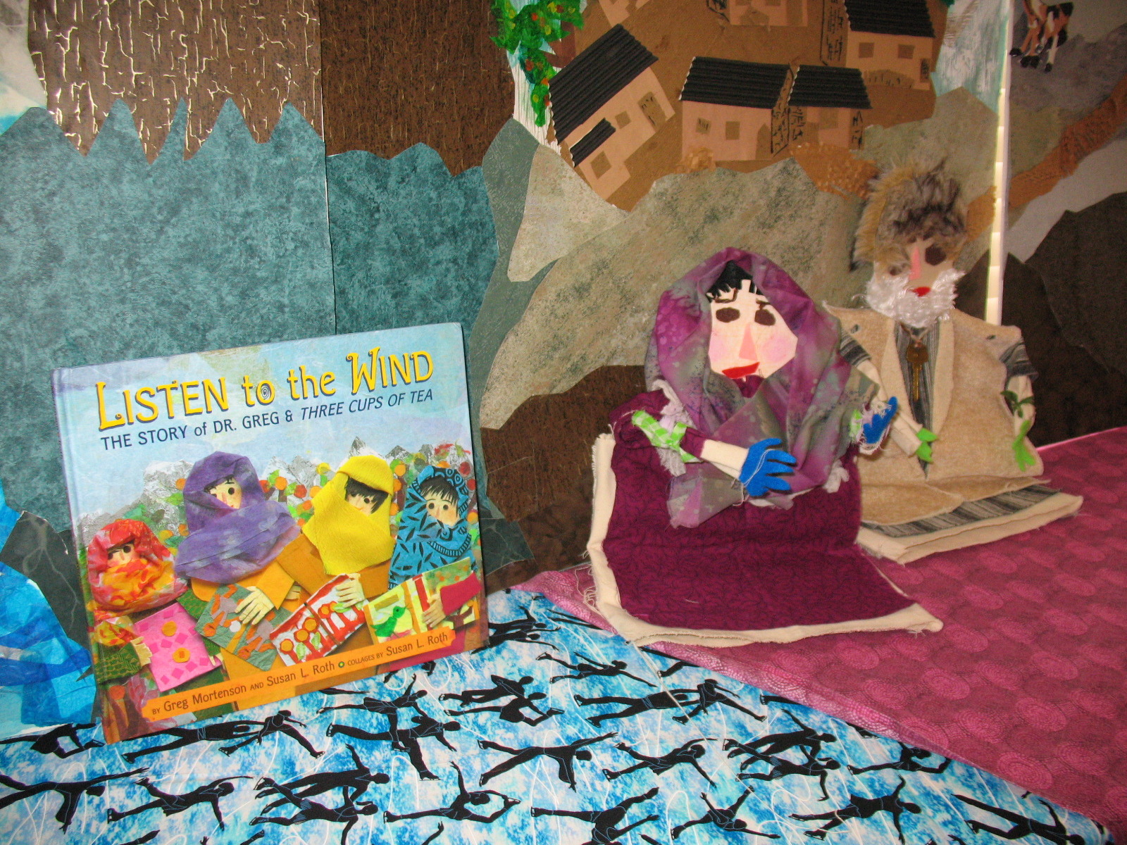 Art teacher Katharine Ayer and third grade teacher Mary O’Brien have been team teaching an integrated unit based on the book “Listen to the Wind”, by Greg Mortenson. Students have been learning about a different country and culture, retelling a story, creating collage background and puppet characters, and acting out the retelling.