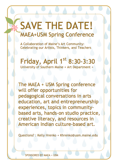 MAEA is partnering with the University of Southern Maine’s art department, Maine College of Art, and Portland Museum of Art. Save the date: April 1st, 8:30-3:30 for a Spring conference. It promises to be a day filled with teachers, artists, and thinkers!