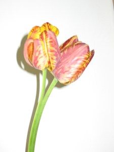 Last year I was given a bunch of flower bulbs that I call “mystery bulbs”. The names were unfamiliar and there were no pictures to give me a clue as to what they might look like. I planted them and forgot about them over the winter. This Spring my beautiful red tulips came as they normally do and about a week later I noticed 5 different types of flower bulbs that resembled tulips. Some had pointy tips at the top of the flower, some were bright yellow, and some were very petite. And then I noticed a flower hidden in a close by small bush that hadn’t gotten it’s leaves yet. At a closer look I noticed that there were two flowers. And still closer I noticed only one stem. How could this be?! I don’t know if this is the type of tulip or a fluke. I have searched online and haven’t learned anything. I wonder if any of you are familiar with this flower? If so, please write and let me know.