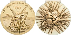 On the Olympic gold medal, Watkins chose to depict the image of Nike, the Greek goddess of victory, stepping out of Greek temple, The Parthenon, to arrive in the host city. On the rear, there are symbolic elements: Olympics logo, venues, and the Thames River flowing through the emblem from left to right and diagonal lines cutting through in every direction.