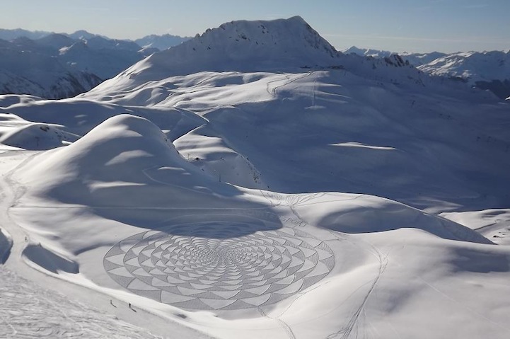 I wouldn’t mind visiting the frozen lakes of Savoie, France where Mr. Beck spends days plodding through the snow in raquettes(snowshoes), creating these sensational patterns of snow art. He works 5-9 hours a day, each final piece is typically the size of three soccer fields ! Imagine??!! The geometric forms range in mathematical patterns and shapes that create stunning, sometimes 3D, designs when viewed from higher levels.
