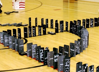 On Dot Day, which I think was on the afternoon before Spring break, everyone was asked to dressed the part and wear dots. We met in the gym with a few students to set up a very large maze with all of the dominoes. The physical education teacher, Joel Lufkin, was a great help. I will never forget every breath of wind caused problems. The few student helpers were crawling carefully along the floor as they set up the maze so they wouldn’t cause one of them to topple over. Imagine what happened?!! Joel had to dive to stop the chain reaction more than once. When all 300+ were close to being in place, we called for each class to come to the gym. Joel, along with the helpers, protected them from falling down. I never thought about what kind of air was moved by people by simply walking.