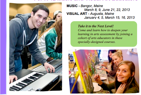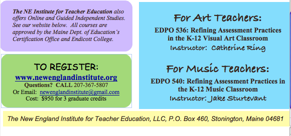 Posted in assessment, Communication, Curriculum and Instruction, Music, Visual Arts | Tagged arts assessment course, arts education, Catherine Ring, Jake Sturtevant, Maine, New England Institute for Teacher Education | Leave a Comment »