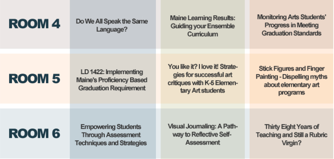 These 35 workshops are being presented by YOUR colleagues from throughout Maine. You will be able to attend three workshops. The Maine Arts Assessment Initiative’s teacher leaders will be providing the following workshops: