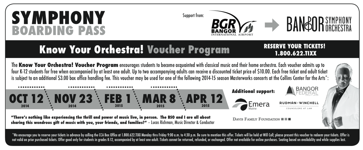 The Know Your Orchestra! voucher program encourages students to become acquainted with classical music and their home orchestra. Each voucher admits up to four K-12 students for free when accompanied by at least one adult. Up to two accompanying adults can receive a discounted ticket price of $10.00. Each free ticket and adult ticket is subject to an additional $3.00 box office handling fee. The voucher below may be used for any of the 2014-15 season Masterworks concerts. We encourage voucher holders to reserve their tickets before the concert by calling the CCA Box Office at 581.1755 or 1.800.622.TIXX, Monday thru Friday 9:00 a.m. to 4:30 p.m. Please copy the attached black and white file “KYOboardingpass_2014” and distribute it widely.