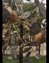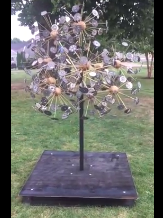These were then fired and installed on 1/8″ brass rods into which I cut threads on either end, to allow them to screw into a metal insert in maple orbs, which I turned on the lathe. The result looks like dandelion fluff, or atoms, or drawn circles.