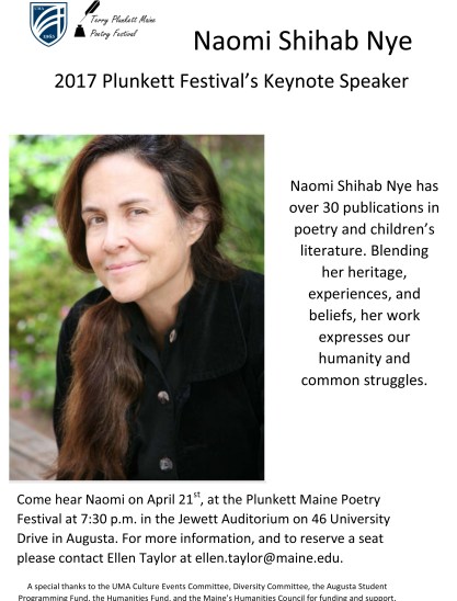 On April 21, at the University of Maine at Augusta’s celebrated Terry Plunkett Poetry Festival, internationally acclaimed poet and children’s literature writer, Naomi Shihab Nye, will appear as the keynote speaker. The event begins at 7:30pm, at UMA’s Jewett Hall Auditorium, on 46 University Drive, Augusta. The event is free and open to the public, but reservations are recommended.http://www.uma.edu/academics/programs/english/terry-plunkett- maine-poetry-festival/.