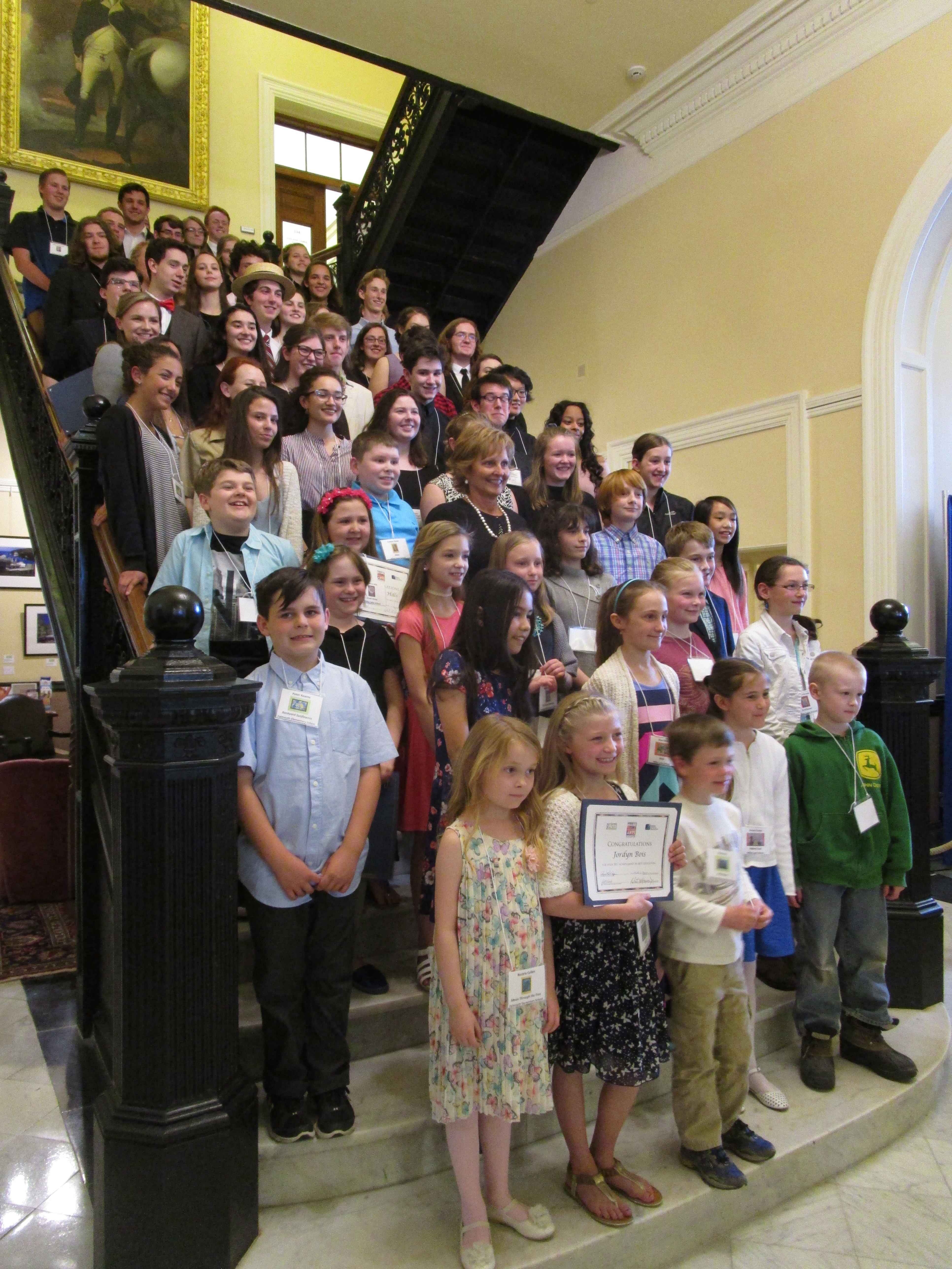 Students had their photo taken with the First Lady Ann LePage on the steps in the Hall of Flags at the Maine State Capitol