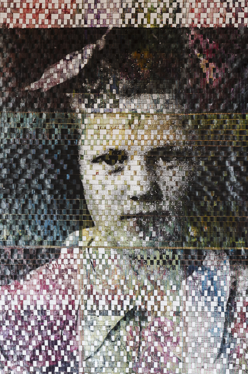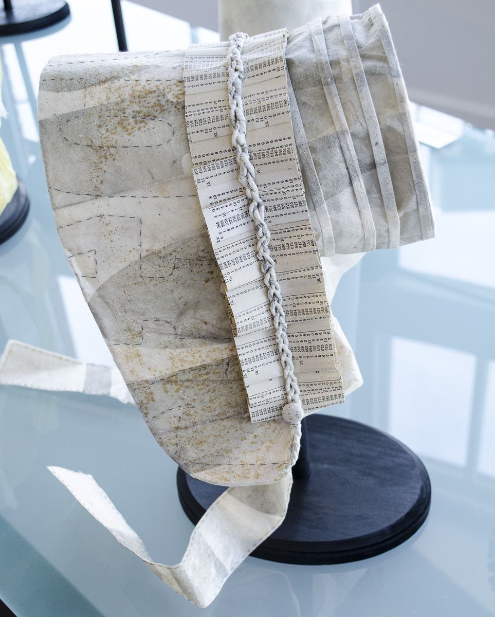 This exhibition features work by a diverse group of artists referencing Maine textile history. The collection of work within “Threads of History” ranges from woven portraits using photo transfers, to garments and wall pieces made of paper, cloth and bark fiber. Items of clothing include bonnets made of paper, shoes formed from gold wire, and a coat assembled from picture postcards. Hooked rugs, woven photographs, handmade paper assemblages, and a canvas floor cloth are all shown. As one example, artist Jill Snyder Wallace calls her piece “Lost Industry,” “an ode to the demise of the textile, shoe and wood turning industries of Maine.”