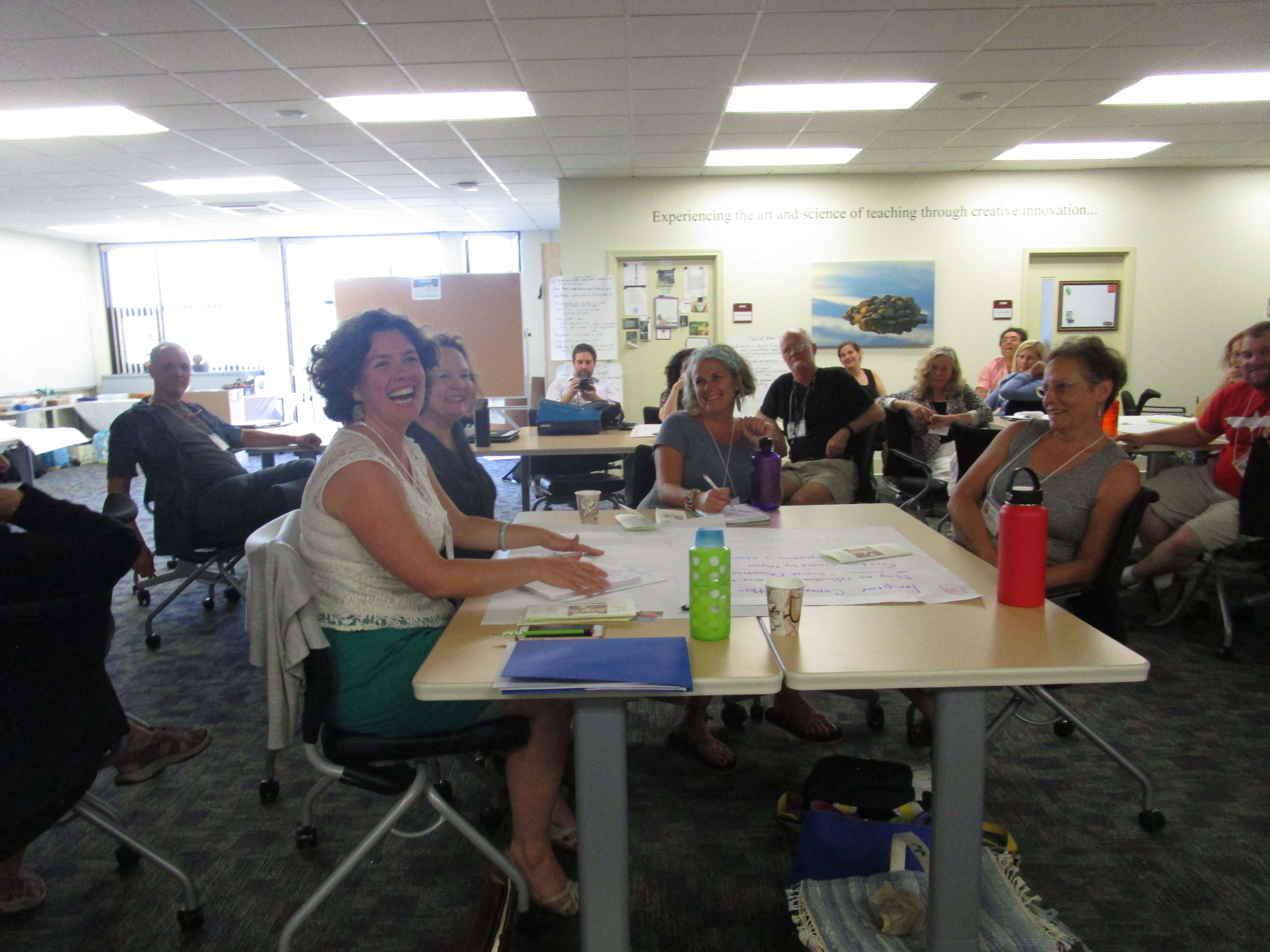 Almost 70 educators fit into three strands of visual and performing arts educators, teaching artists, new teacher leaders, and returning teacher leaders. The threes strands schedules differed slightly as the learning was customized to their needs. The highlights for the day included standards and assessment, communication, networking, visual storytelling, drumming, creativity and much more.