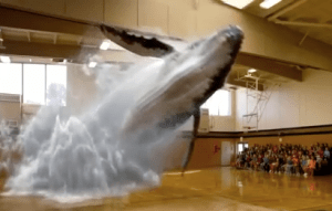This video is just over a minute long that is a holographic projection of a whale. It is a photographic process that produces images thanks to the differences between two laser beams. These images are projected into a gym using a special camera. You can see the students in the background sitting on the bleachers. In the video you can see the students faces of surprise in the foreground. There is not a drop of water in this room, let alone a whale. To view the video CLICK HERE.