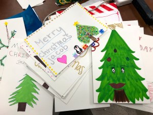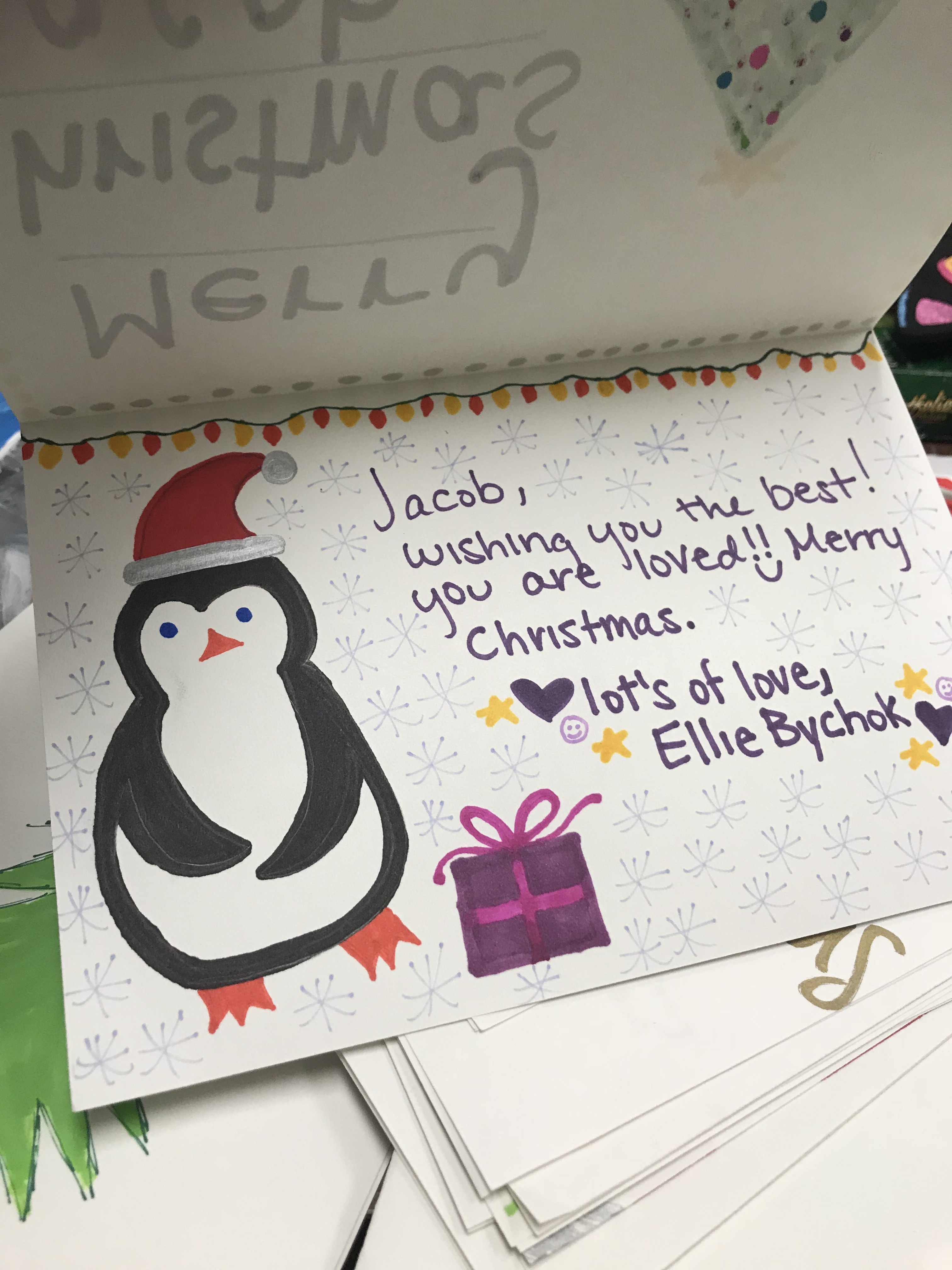 The next day I explained Jacob’s story to all of my students – my Art 1 classes, my Ceramics classes, my sculpture classes, all my classes. Many of the kids had heard of Jacob and had even thought about making a card for him. That day we all made cards. We painted, we folded, we drew, we threw penguins everywhere we could. Other classes in other parts of our school heard what we were doing and contributed their own cards. And they wrote – unprompted – some of the most heartfelt wishes for a Merry Christmas and support and good wishes I’d ever heard. The true power of art was on full display and the kids ‘got it’. They saw what art can do for the soul and for others. Looking at the stack and having experienced the tremendous enthusiasm and energy the kids exhibited that day, I was moved to tears. I have a little boy about Jacob’s age. As a teacher, I don’t think I’ve ever been more proud of a group of kids.