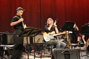 Brewer High School music teacher Brady Harris was having a lesson with resident jazz musician Mike Stern. At first glance from the center of the Brewer Performing Arts Center Mike looked like a high school student. Later I realized he connected with the students quickly and easily because he was in many ways much younger than his age. They went back and forth comfortably before the high school jazz students arrived for rehearsal and they all jumped right in to making music. I was so impressed! The middle school students followed for rehearsal and their first time meeting Mike (due to the storm). Led by Lanissa Nadeau the students were so well prepared and played amazingly! My only disappointment was that I couldn’t stay for the evening performance but I understand that it was a big success!