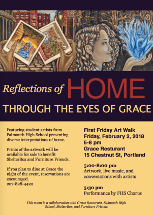The artwork displayed is designed to inspire the viewer to think of what home means to them, and also to raise awareness and a reminder that after news of a natural disaster has slipped from the headlines, pressing issues regarding the human cost of a lack of housing remains. At 5:30 pm the FHS Chamber Singers will perform two selections from the balcony in the restaurant.