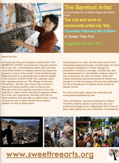 The documentary film by Glenn Holsten and Daniel Traub, The Barefoot Artist, will be shown on Thursday, February 8, 6:30 p.m., Sweet Tree Arts, Hope.