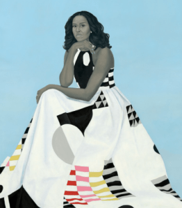Amy Sherald was the artist who painted the former first lady. Amy is from Baltimore and is known for her unique styles, and her portraits tend to underscore themes of social justice. Both artists developed relationships with the former president and first lady. Sherald’s work is less about realism in composition and more about shape and color. Sherald and Wiley are the first African-American artists to create Smithsonian-commissioned portraits of a former president and first lady.