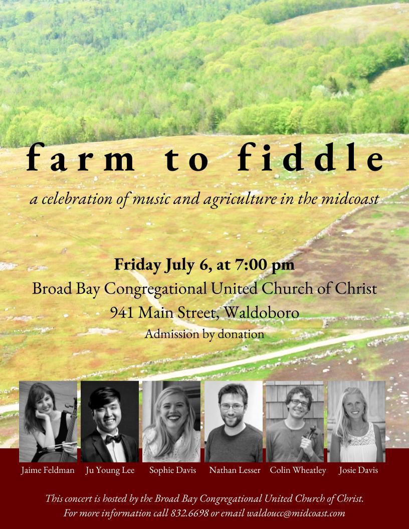 Sophie and Josie Davis are planning their concert “Farm to Fiddle” on Friday, July 6 at 7 p.m. in Waldoboro. Their wonderful friends Nathan Lesser, Jaime Feldman, Colin Wheatley, and JY Lee will join them in a performance that celebrates beautiful music and local farms in the Midcoast area. The concert at the Broad Bay Church in Waldoboro.