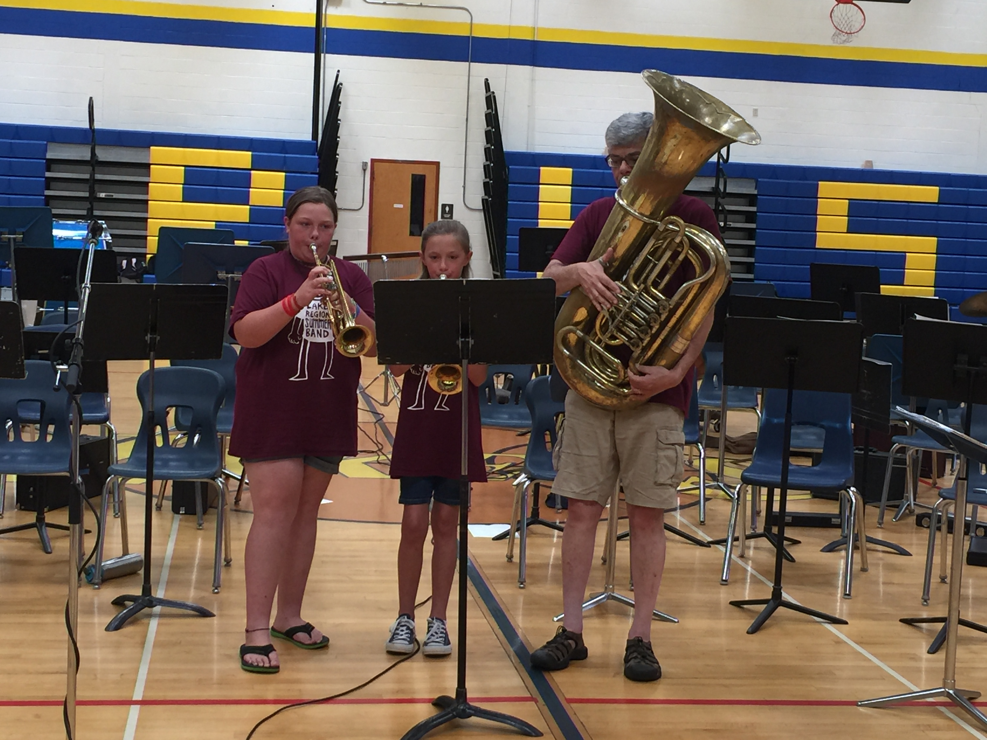 Retired music educator Paul Greenstone assisting in a summer music program in Lake Region Summer Band Program for students entering Gr. 5 through high school. Shirts designed by Paul’s son, Andrew Greenstone. Photo by music educator Jenni Null who is recently retired and teaching one day a week.