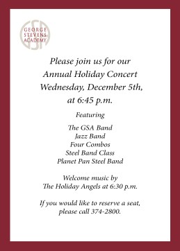 The Annual Holiday Concert – WEDNESDAY, DECEMBER 5, 6:45 p.m. featuring the George Stevens Academy (GSA) Band, Jazz Band, four Jazz Combos, the Steel Band Class & Planet Pan Steel Band. Welcome music will be performed by the Holiday Angels at 6:30pm. If you would to like reserve seating, please call 374-2800.