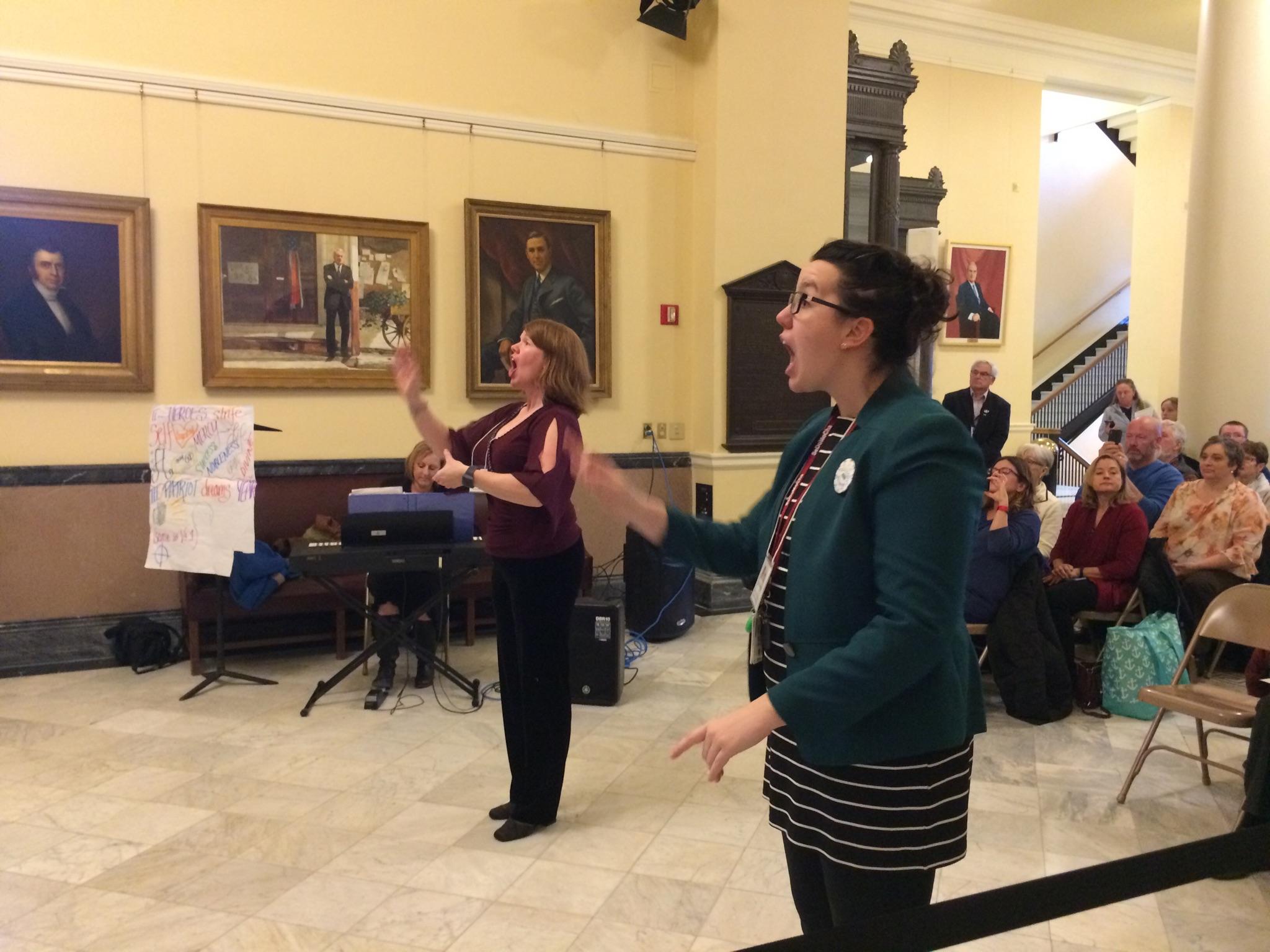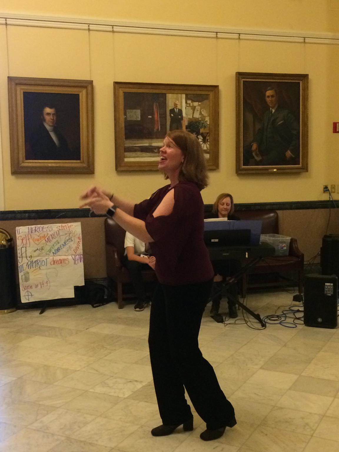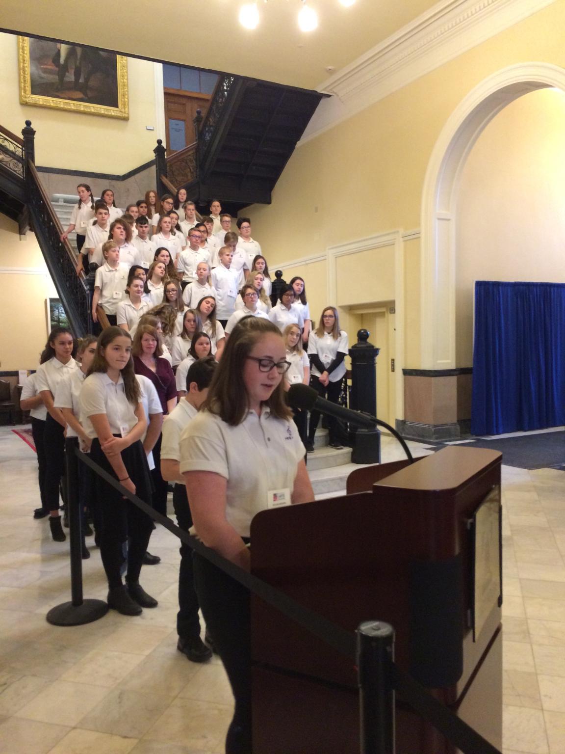 Last Tuesday at the State House Complex the celebration for the Maine Excellence in Arts Education was held. The Maine Arts Commission (MAC) was proud to invite young artists and musicians from throughout the state and recognize them for their accomplishments. Over 250 attended the ceremony including 160 students from SeDoMoCha (Dover-Foxcroft) and Marshwood (Eliot) Middle Schools, 45 teachers and students from 9 Maine schools/districts. The chorus students had never met each other yet they came together and sang America, the Beautiful (arr.