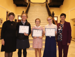 Amy Cousins, Gorham Middle School art teacher and two of her students receiving their certificates from Argy Nestor, left and Julie Richard, right