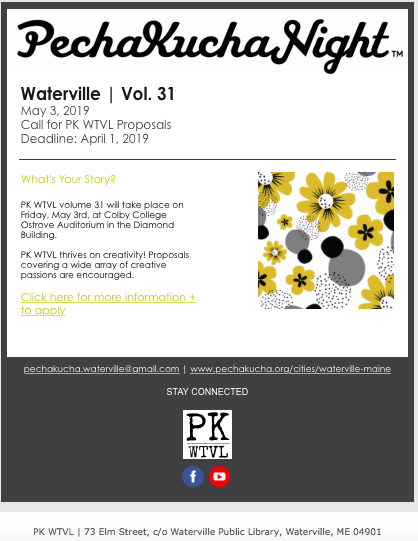 Posted in Community, Opportunity | Tagged Pecha Kucha, PK Waterville, storytelling |