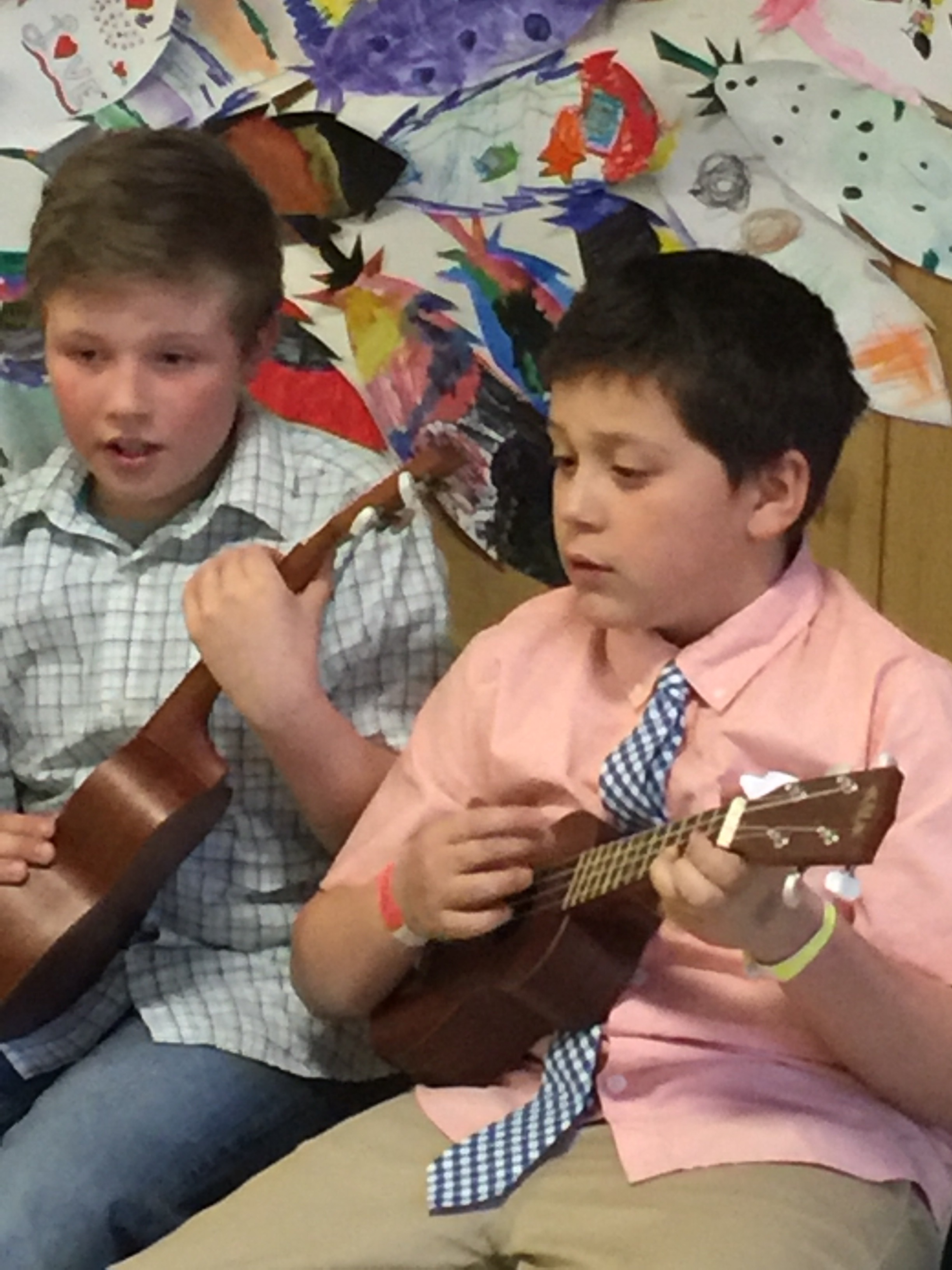 Recently, the 97 students at Sebago Elementary School returned to school with parents and friends to enjoy an evening of arts festivities and entertainment. The entire school building was filled with colorful visual artwork created by children in Kindergarten through Grade 5. The students were clearly excited to show off their masterpieces. There were musical performances provided by the Chorus, the Grades 4 and 5 Bands, and for the first time, the newly formed Ukulele Club. The music added atmosphere for those lost in the beauty and imaginative visual displays around them.