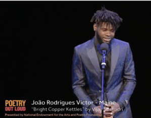 Joao Victor represented Maine and was scheduled during the first time slot, 9:00 a.m. – 12:00 p.m. He recited two poems along with 17 other students. Students at Lewiston High School watched from their classrooms along with students, teachers, and community members from across the state. Everyone was excited when Victor’s name was called as one of 8 students to move to the next round, reciting a third poem.