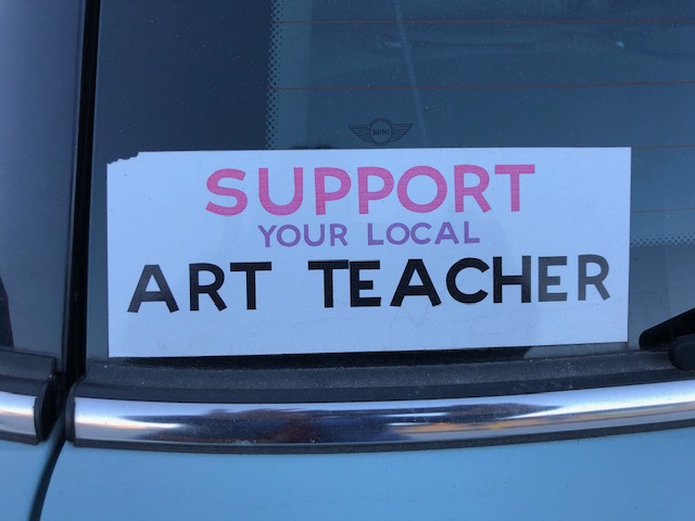 A few days ago I pulled into the parking lot of Hannafords in Topsham. I happened to park next to a car with the bumper sticker you see in the photo below. I’ve seen the car before and wondered who it belonged to. I was in luck, when I came out of the store there was the owner of the car putting her groceries into the back. Turns out it was Amy Crosby who is an art teacher in Brunswick at the elementary level. Thanks Amy for promoting the arts!