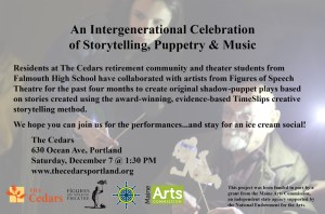 On Saturday, December 7, students from Falmouth High School (FHS) and residents of The Cedars retirement community in Portland will gather for An Intergenerational Celebration of Puppetry, Storytelling, and Music. The event will mark the culmination of a four-month long project in collaboration between FHS, The Cedars, and Figures of Speech Theatre (FST).