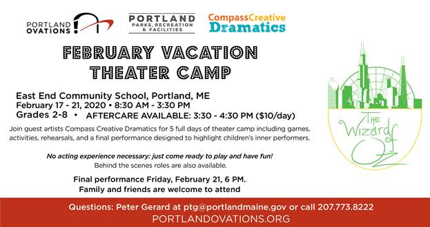 You can ensure your child’s February break is filled with creativity, growth, play, and the exploration of endless imaginative possibilities by registering them for Ovations Offstage/Portland Recreation’s Theater Vacation Camp! This camp is great for kids who have no theater experience to those who have participated in a few productions or taken a few theater classes. The teaching staff is well able to differentiate across experience and create a place for each student to be an integral member of the ensemble. All students will participate in the following workshops throughout the week: Stage Basics, Accelerating Imaginations: An Intro to Acting, Musical Theatre Singing, Puppetry along with theatre games and rehearsals for the final production. Click on the image below for more details.
