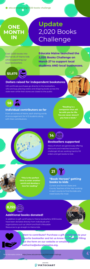 Please help us spread the word about the challenge so we can continue to support students and our local booksellers. As you know, instructions on how to contribute to the challenge are on our website, and you can track progress via Educate Maine’s social media channels.