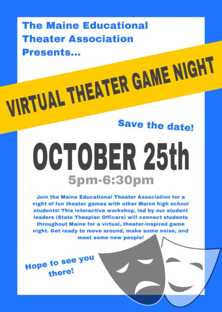 Maine high school students are invited to participate in a virtual theater game night. The Maine Thespians officers will lead participants in an interactive workshop at no cost. Mark your calendars and join teens from across the state – Sunday, October 25, 5:00 – 6:30 p.m. This event is provided by the Maine Educational Theater Association.