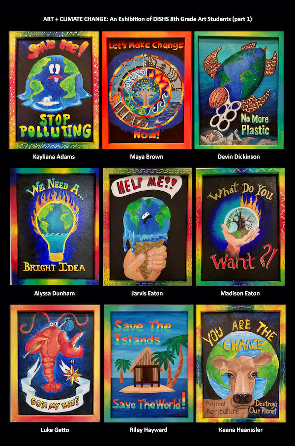 The Deer Isle Stonington High School 8th grade Art students have produced a number of paintings reflecting their thoughts and feelings about climate change and their global concerns. In this show, you will see hope, anger, humor, and a plea for everyone to wake-up and take action. Above all else, the art show reflects the concerns our students have for their future. This show is about raising awareness!