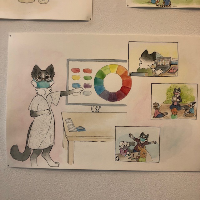 My art practice revolves around my playful, childlike personality so creating children’s book illustrations is a perfect way to depict snippets of my past experiences that have led up to the MAT program. The smaller panels depict experiences that inspired me to work with children. The medium panels depict major factors that played a key role in planting the seed of going in art education. And lastly the largest panel is of the MAT program, focusing around teaching with small snapshots of different moments, from online observation and working with students from Waynflete and Portland Rec Center. I’m continuing to learn and I’m getting there.