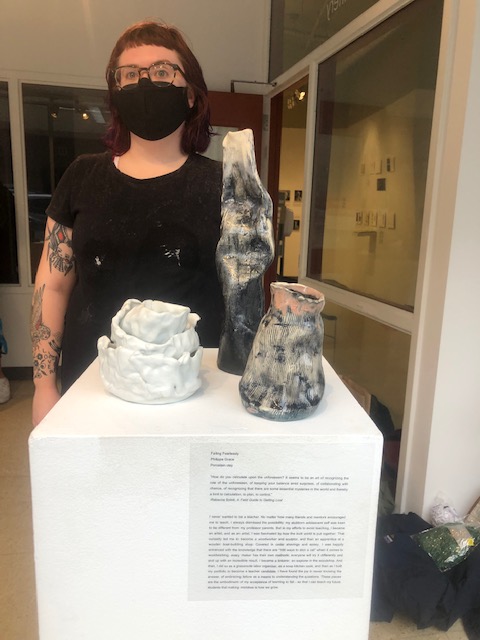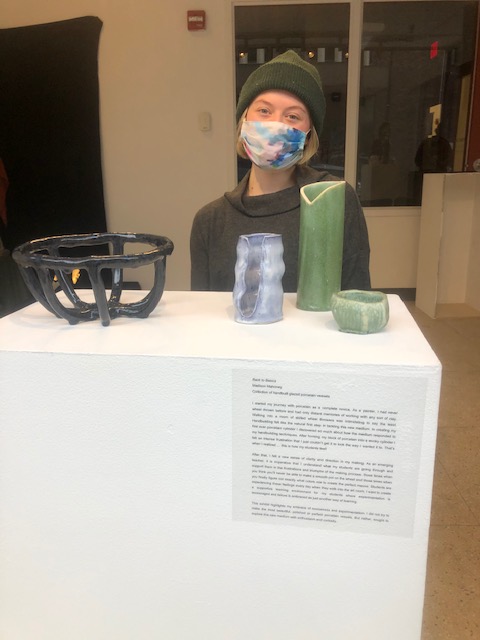 The exhibit “Getting There” is a reflection of our individual and collective experiences as students learning to be teachers, while also nurturing our creative practice. In addition to our coursework, observations, and field work, all ten of us have been auditing BFA classes at Maine College of Art this fall. Due to limited class sizes because of the pandemic, we weren’t all able to be in our top choice – but we all learned so much. Although our initial prompt was to tie our experience of learning to teach while being an artist to our BFA class, we all expressed ourselves in different ways – from portraits of each other, to new skills we learned, to creating artifacts for future lesson plans. The show is a time stamp of our cohort on the cusp of student teaching this winter. Though this is an unusual year, we are all eager to join the field of art education!