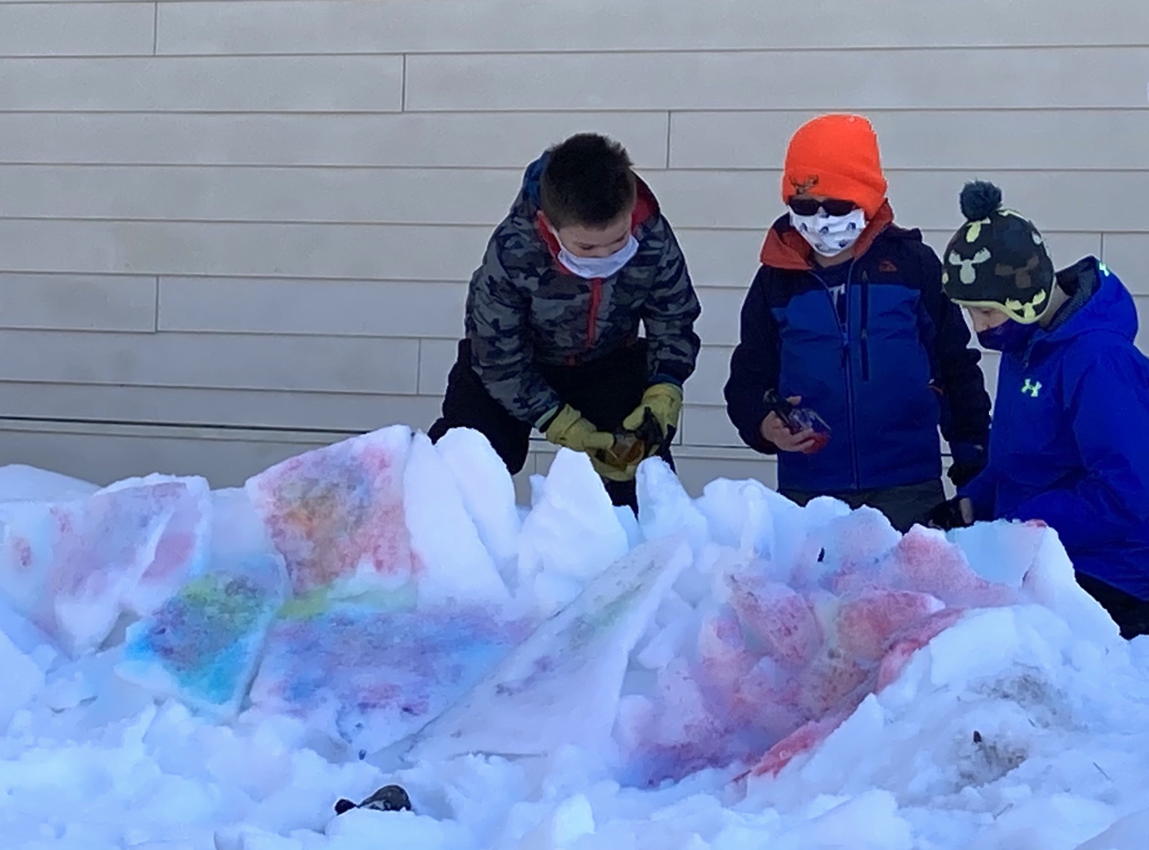 - My silver lining is the freedom this chaotic moment in time has presented to try something completely different. I am sharing photos from one of my third grade classes this week. We went outside to make art as a whole-class reward for the great choices they’ve made during the last 6 weeks that we’ve all been back together at Madison Elementary. (Other classes will earn their “Outside Art”, too. It just may take a little longer : ) I gave these students snow block makers and spray bottles filled with watercolor paint and pointed them to the snow. It was a blast and it made my art teacher heart happy to see the creativity and teamwork this class demonstrated. ~ Lisa Ingraham, K-4 Art Teacher, Madison Elementary School, K-12 Gifted & Talented, MSAD 59