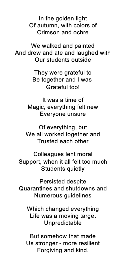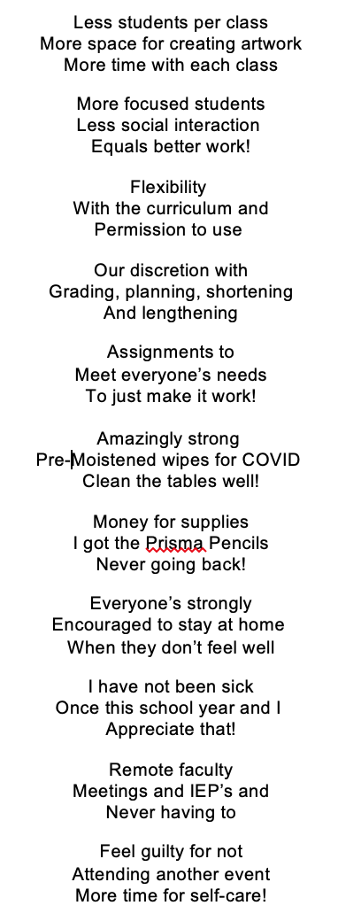 The following Maine Visual or Performing Arts Educators kindly provided their “silver linings” of the pandemic. We all have them, what is yours? Please email your silver linings at meartsed@gmail.com so we can continue to learn from each other.