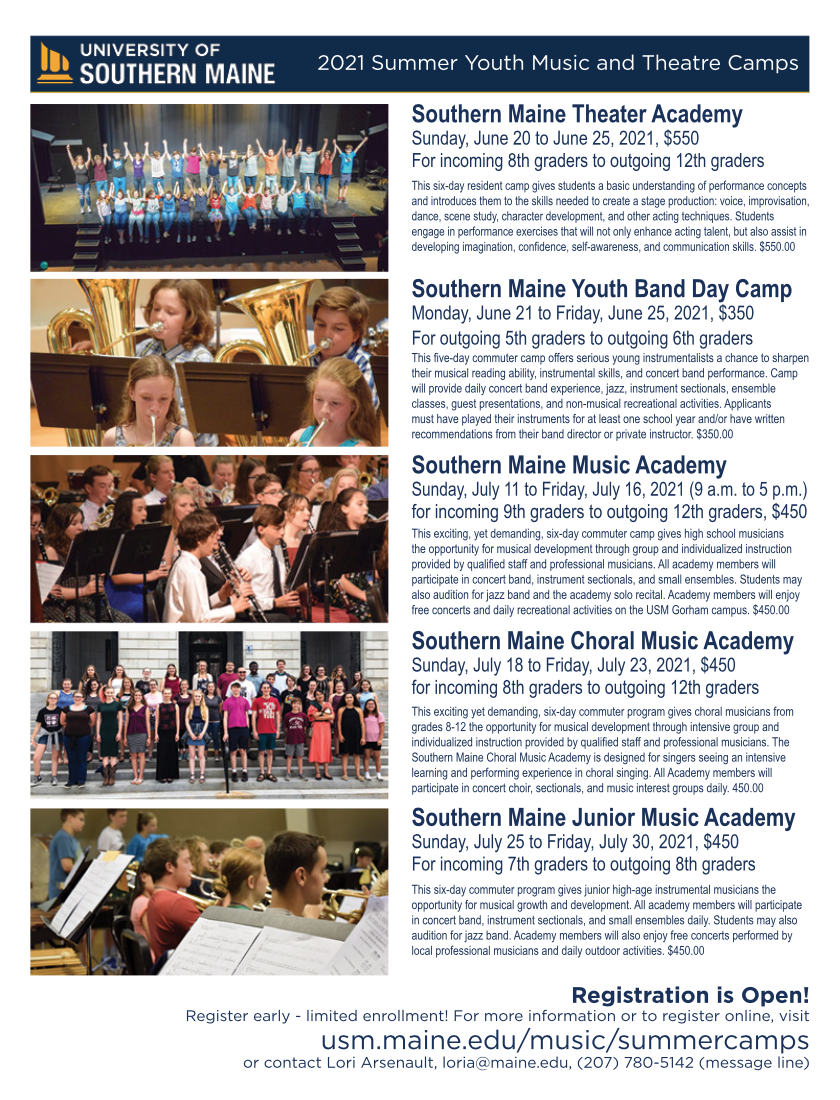 USM Summer Youth Music and Theatre Camps are happening this year. Five great camps on the USM Gorham campus. Registration is open, space is limited. We have some changes for 2021 as we recover from the last year.
