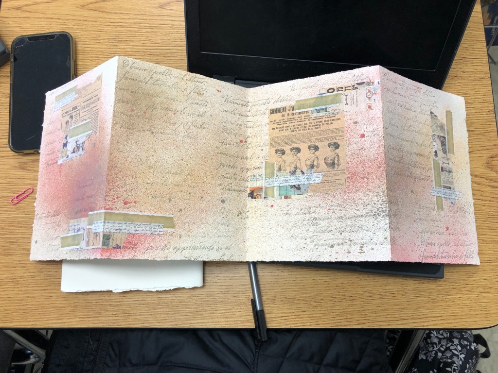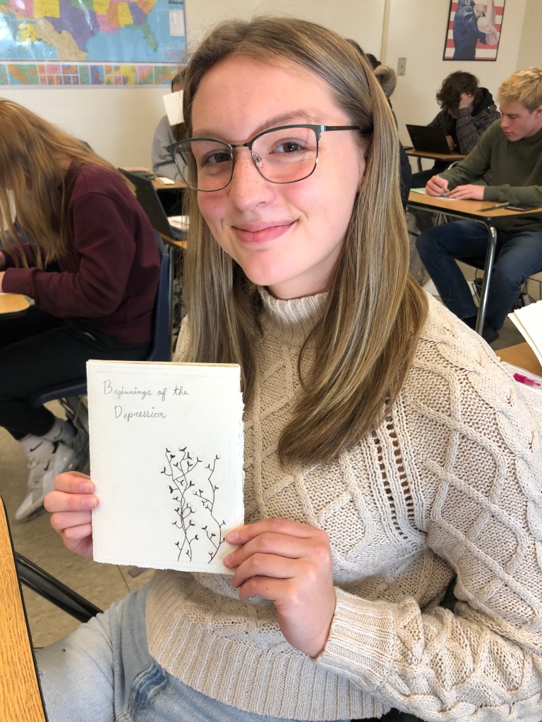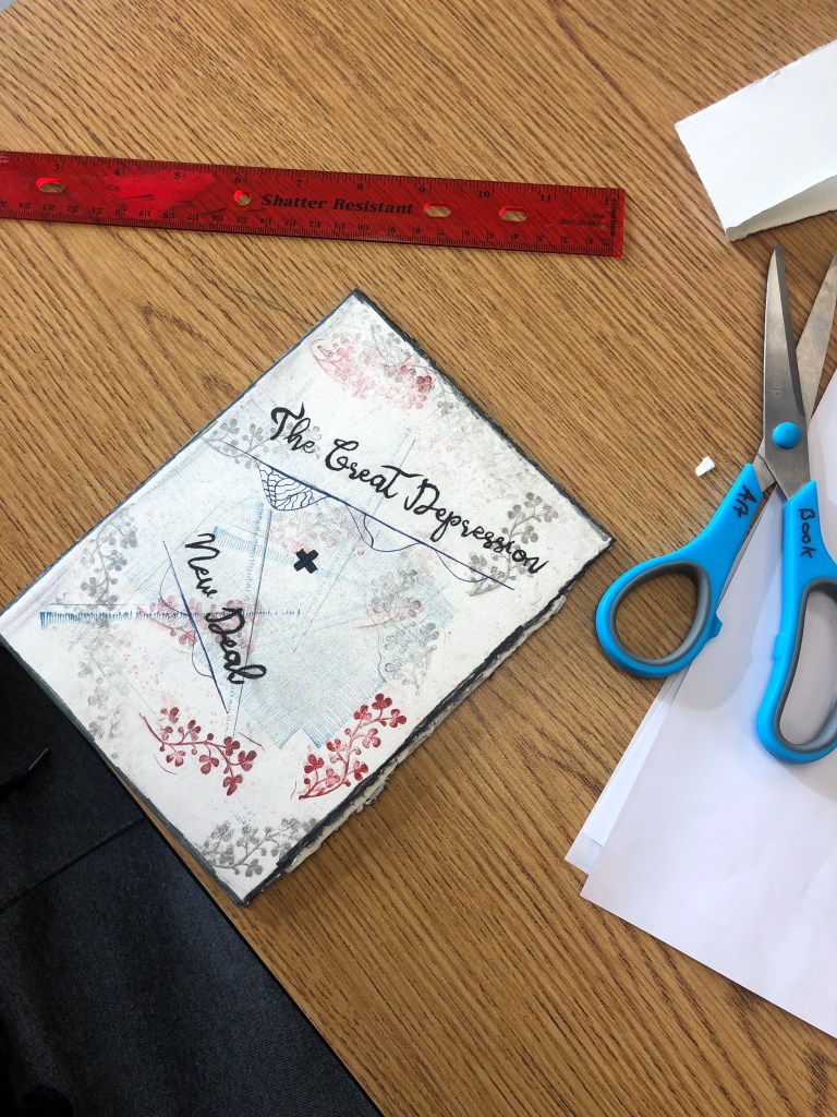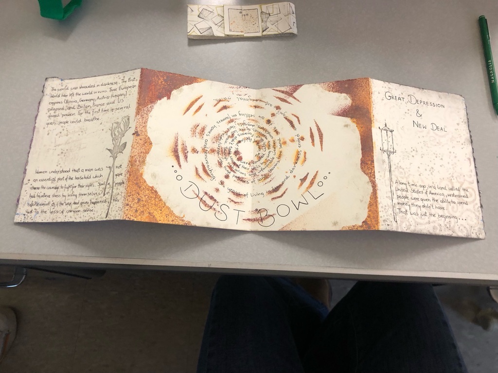 After I met Sharon at the Book Arts workshop we arranged a day for me to visit GAHS. I spent time with students in the social studies class with teacher Susan LeClair. Students were totally engaged in creating accordion books on The Great Depression and New Deal. The approach was structured but flexible, the materials plentiful, the atmosphere was supportive, relaxed and creative. The classroom was set up similarly to a ‘workshop model’. Students are introduced to history material, art materials and techniques at different intervals in the book making process. They work independently understanding their goals using a rubric based on a total of 100 points.